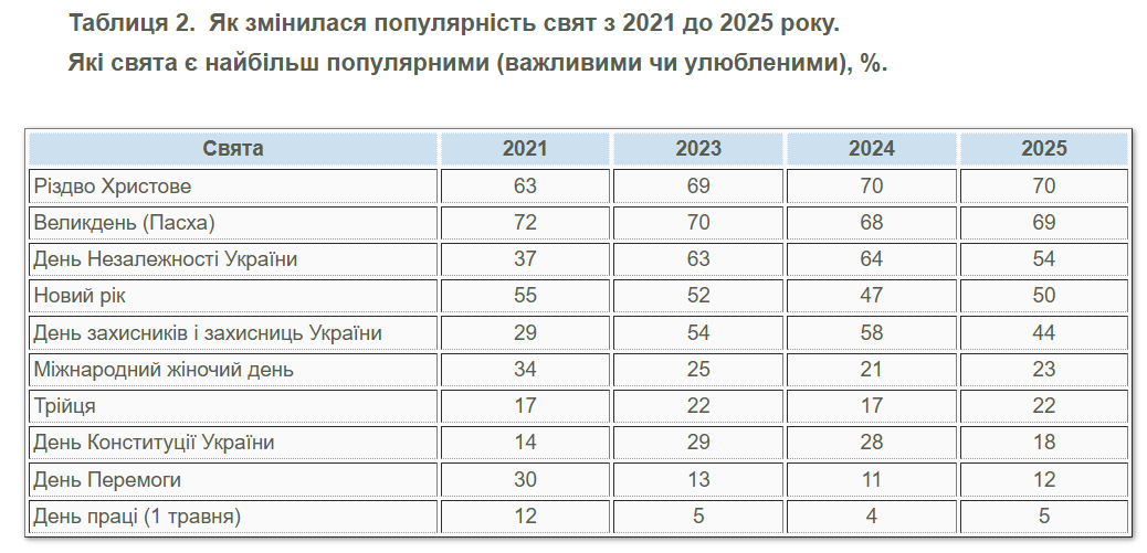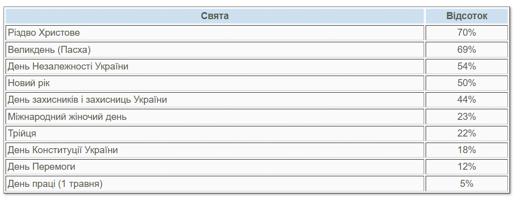 Згідно з даними дослідження, найбільш популярними залишаються Різдво Христове (70%) та Великдень (69%). Вони стабільно займають лідируючі позиції протягом останніх років. За останній рік ставлення до них не змінилося.