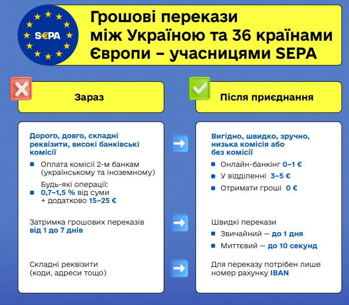 "Приєднання України до SEPA дозволить громадянам та бізнесу здійснювати перекази у євро між 36 європейськими країнами - учасницями надзвичайно швидко, без додаткових комісій та за чітко встановленими правилами", - заявили в Мінфіні.