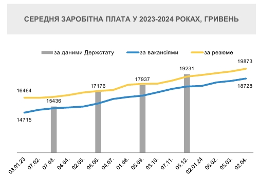 За даними міністерства, середня зарплата за резюме на сайтах пошуку роботи зросла на початок квітня до 19 873 гривень (16 464 гривень на початку 2023 року). Зарплата у вакансіях збільшилася до 18 728 гривень (14 715 гривень в січні минулого року).