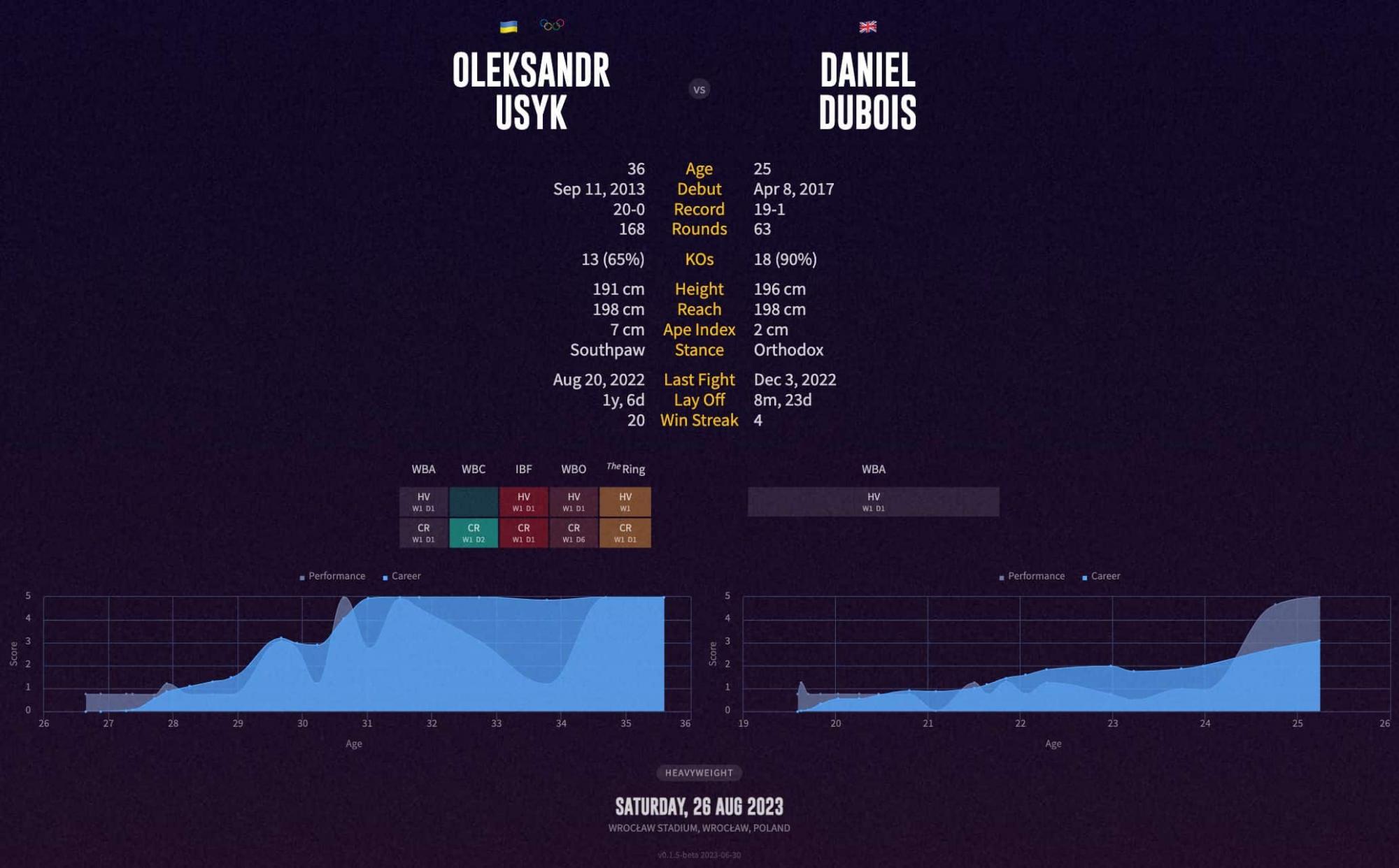 Бій Усик – Дюбуа відбудеться 26 серпня у польському Вроцлаві. У ринг боксери вийдуть на місцевій Tarczynski Arena. Початок поєдинку не раніше 23:00. Володар чемпіонських поясів WBA, WBO, IBF, IBO та The Ring у надважкій вазі Усик зустрінеться з регулярним чемпіоном за версією WBA Дюбуа.