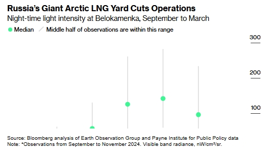 На будівельному майданчику "Новатека" інтенсивність світла була найвищою у період з 2022 по 2023 рік, що збіглося з періодом, коли на об'єкті будувалися дві лінії для Arctic LNG 2, показують дані Payne Institute. Наступне затемнення світла в Білокам'янці свідчить про зупинення будівництва на майданчику та відступ від мети Росії зайняти до 20% світового ринку ЗПГ протягом наступного десятиліття.