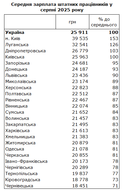 Середня зарплата в Україні у серпні 2025 року склала 25 911 гривень. Проте в регіонах рівень заробітків значно відрізняється - від 18,5 тисяч до майже 40 тисяч гривень.