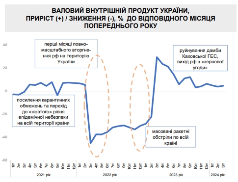 Як зазначається в повідомленні, у березні 2024 року продовжувалася тенденція відновлювального зростання, підтримана стабільною роботою Українського морського коридору, що стимулювало діяльність залізничного транспорту, металургії та добування металевих руд.