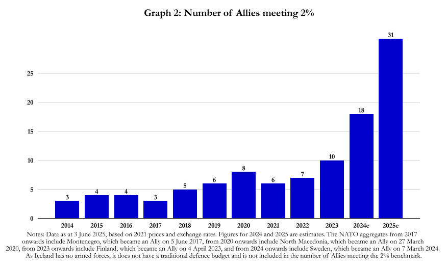 За оцінками альянсу, ще торік понад 10 із 32 членів НАТО не досягли цільового показника у 2%, узгодженого 2014 року. Дані за 2025 рік засвідчили, що всі союзники досягли цієї мети, причому сім країн досягли мінімуму в 2,0%, а кілька інших лише незначно перевищили цей показник.