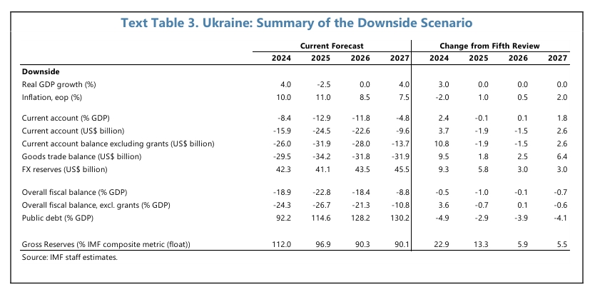 Експерти Міжнародного валютного фонду оновили негативний сценарій для України на випадок більш інтенсивної війни. Сценарій передбачає, що війна триватиме до середини 2026 року.