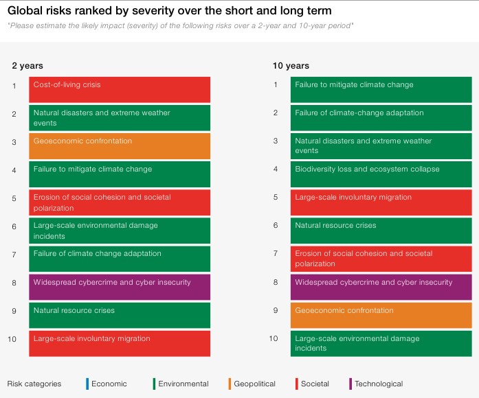 Заснований на відповідях 1200 менеджерів із ризиків з приватного сектору, державних діячів, науковців та лідерів галузі з усього світу, звіт показує, як поточні проблеми вартості життя замінюються ризиками, пов'язаними з навколишнім середовищем протягом десятиліття.