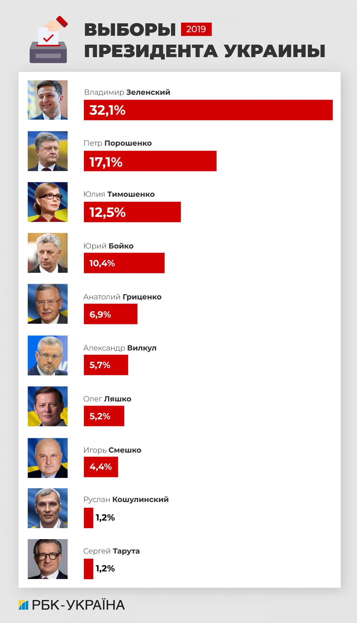 Параллельно с этим, ЦИК продолжал проводить подсчет голосов. Итоговые результаты были объявлены 7 апреля: Владимир Зеленский - 30,24%, Петр Порошенко - 15,95%. Зеленский лидирует практически во всех областях Украины, тогда как Петр Порошенко лишь в Тернопольской и Львовской областях. Тимошенко, которая заняла третье место, поддержало большинство жителей Ивано-Франковской области, а Юрий Бойко, занявший четвертое место, стал лидером по голосам в Донецкой и Луганской областях.