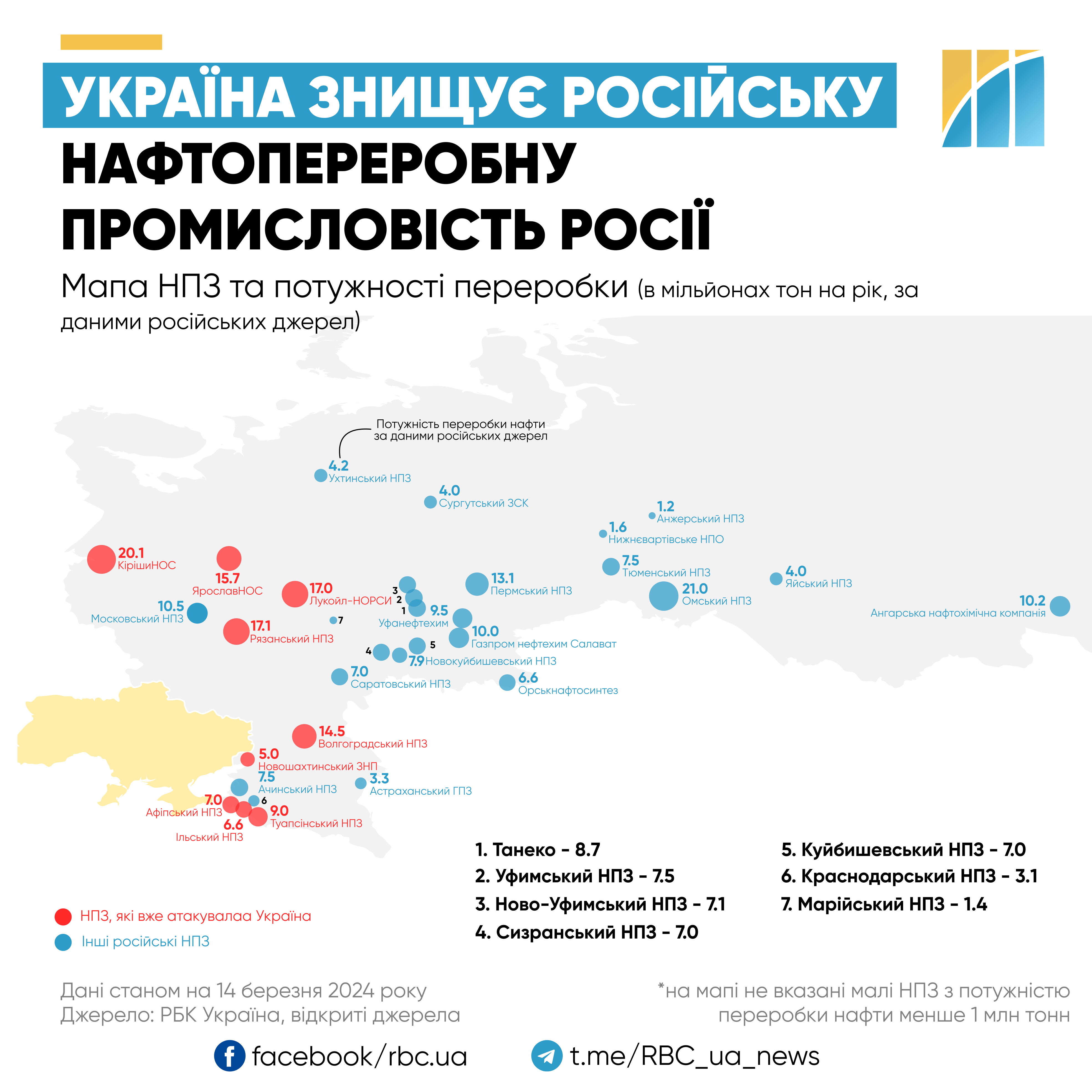 Карта найбільших російських НПЗ (інфографіка РБК-Україна)