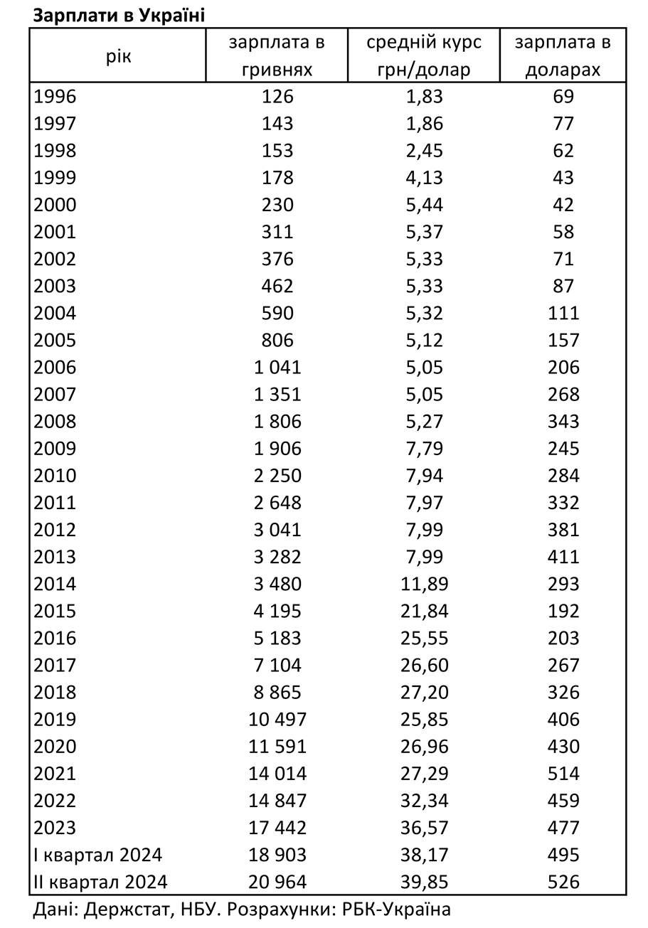 За даними статистичного відомства, середня зарплата штатних працівників в Україні зросла у другому кварталі 2024 року на 22,1% до 20 964 гривень.