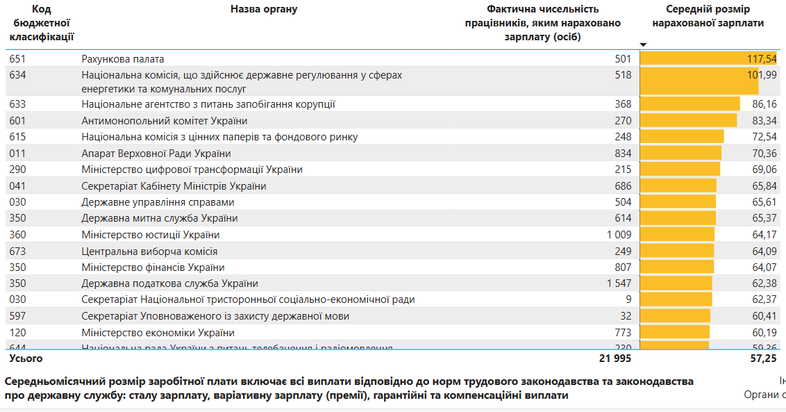 Лідирує за рівнем зарплат Рахункова палата - 117,5 тисячі гривень. Чисельність співробітників - 501.