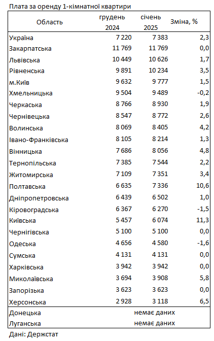 Середня плата за місячну оренду 1-кімнатної квартири в лютому 2025 року становила 7 326 гривень. З початку року ціни зросли на 1,5%.