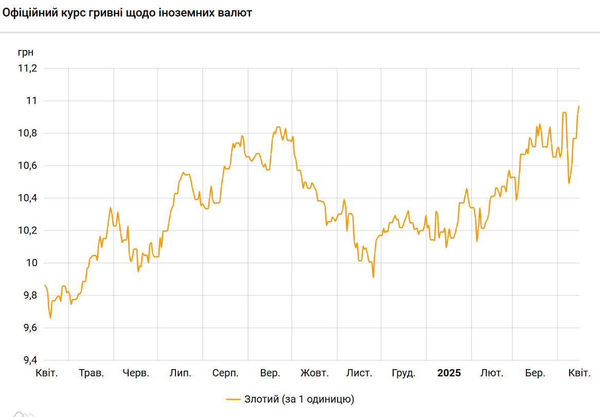 Попередній історичний максимум був 4 квітня 2025 року - 10,9297 гривень за 1 злотий.