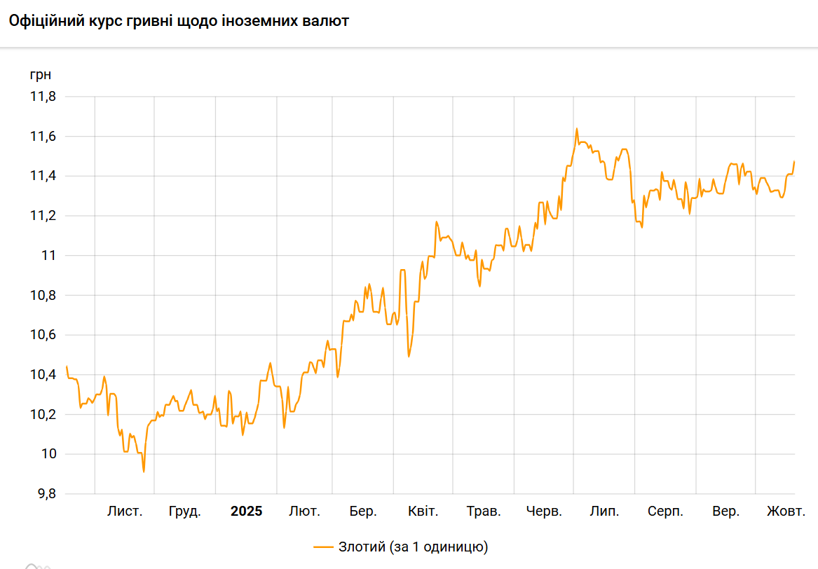 Офіційний курс на 20 жовтня 2025 року встановлено на такому рівні: 11,479 гривень за 1 злотий (+0,0666 грн).