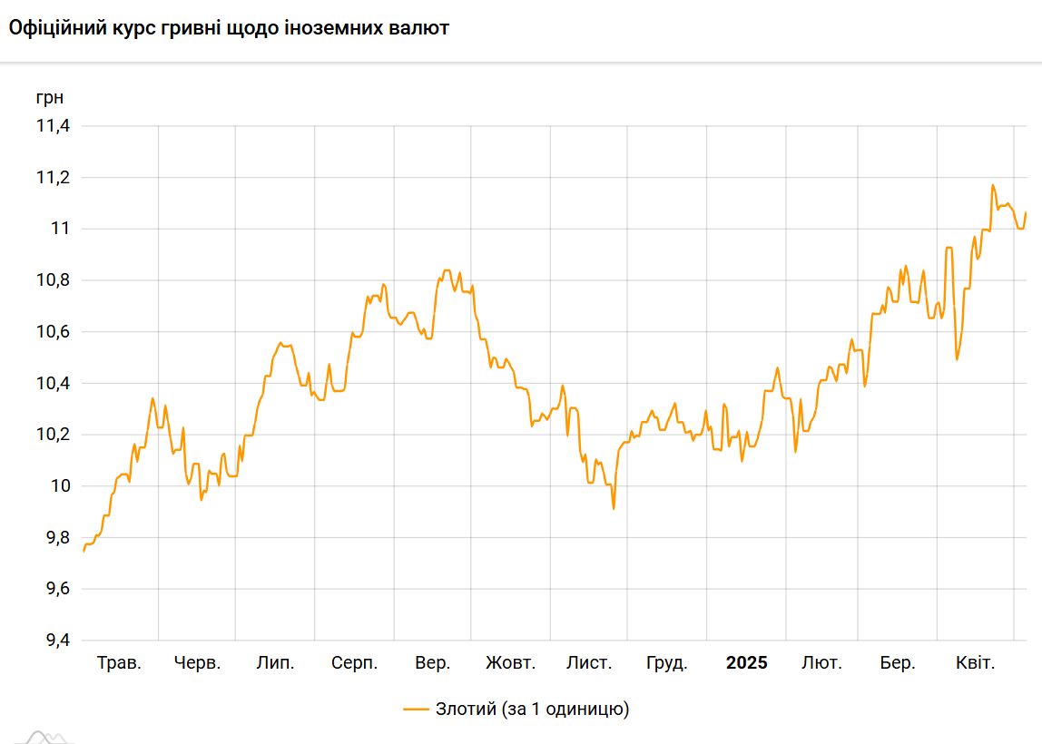 Офіційний курс на 5 травня 2025 року встановлено на такому рівні: 11,0696 гривень за 1 злотий (+0,0666 грн).