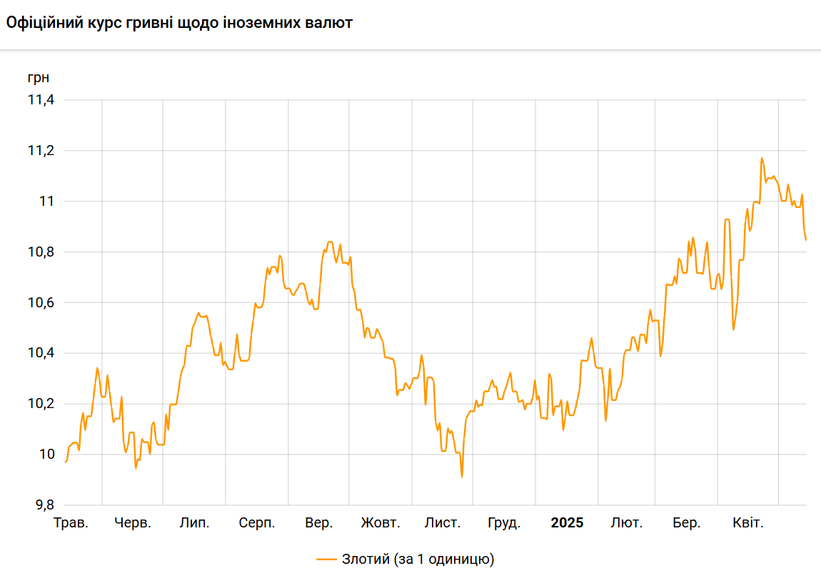 Офіційний курс на 14 травня 2025 року встановлено на такому рівні: 10,8461 гривень за 1 злотий (-0,0387 грн).
