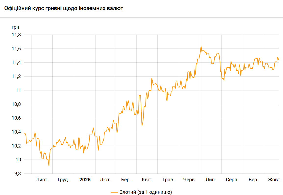 Офіційний курс на 22 жовтня 2025 року встановлено на такому рівні: 11,4339 гривень за 1 злотий (-0,0266 грн).