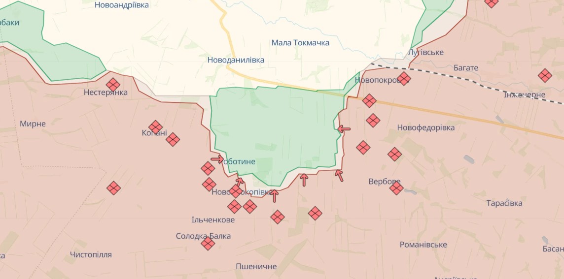 На заході Запорізької області не вщухають бої у Роботинському виступі. Російські "Z-військори" повідомляють про просування на захід від села Вербове нібито на українські позиції. Офіційних підтверджень немає. Західні аналітики фіксують зіткнення в районі П'ятихаток, Копаней, Роботиного та Новопрокопівки.