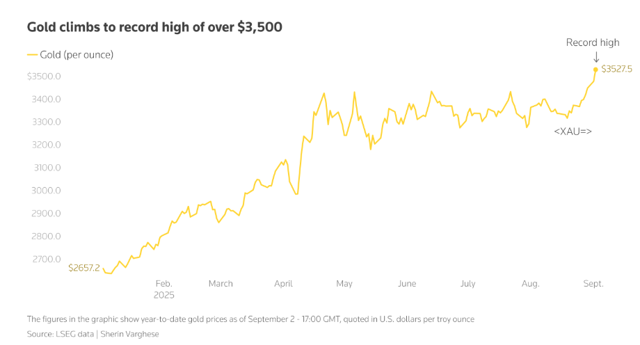 Спотове золото 2 вересня оновило максимум на рівні 3527,5 долара за унцію. Експерти прогнозують діапазон 3600-3900 доларів у найближчій перспективі і не виключають досягнення позначки 4000 доларів у 2026 році, якщо збережуться економічна і геополітична невизначеність.