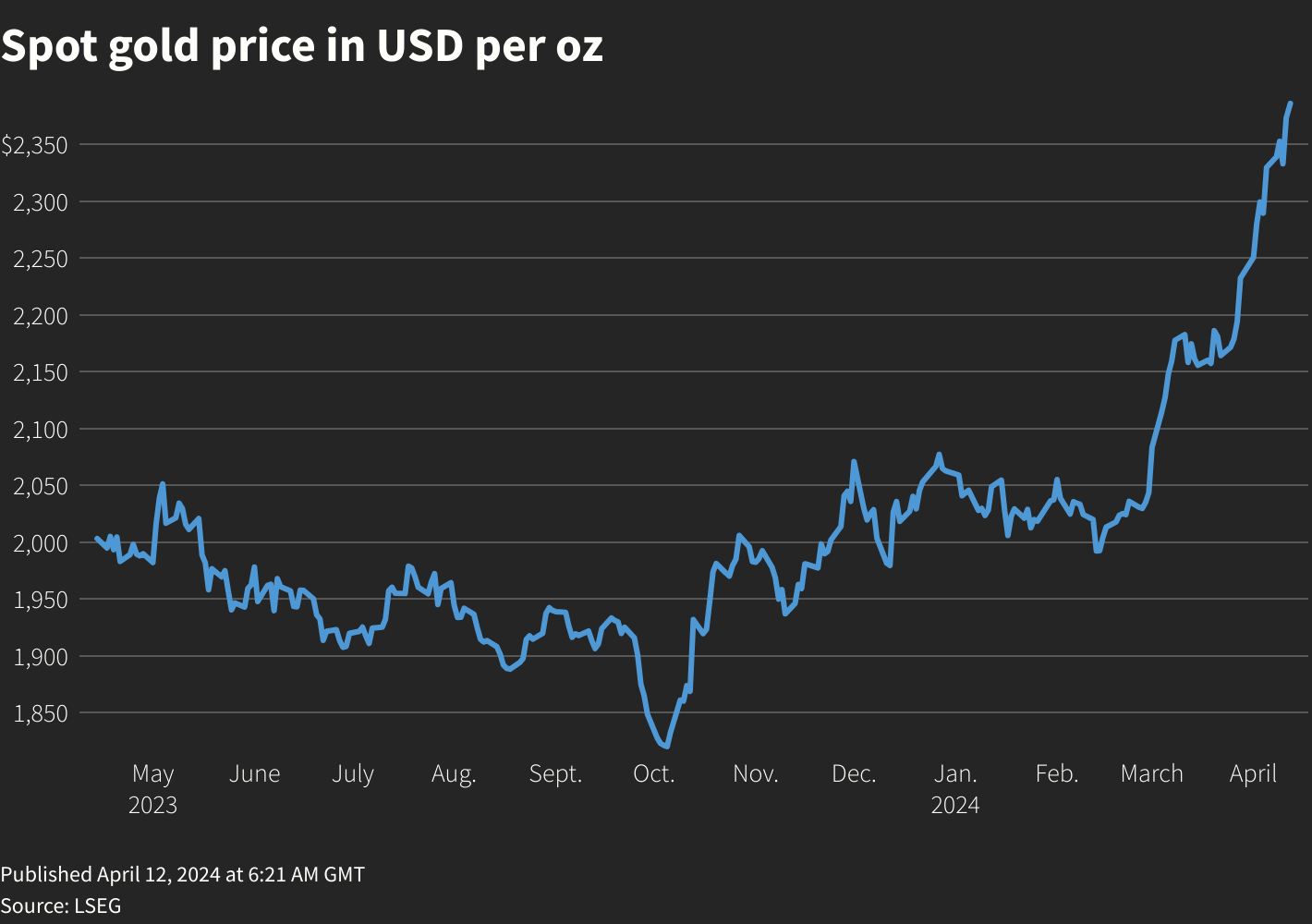Незважаючи на недавні дані щодо інфляції та сильний звіт про зайнятість у США минулого тижня, який викликав ще більше питань щодо можливості зниження ставок цього року, золото готується до четвертого щотижневого зростання поспіль. За рік ціни зросли понад 15%.