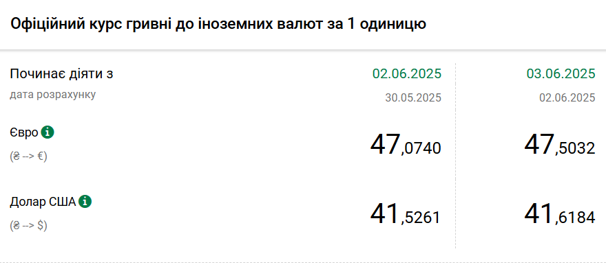 Офіційний курс на 3 червня 2025 року встановлено на такому рівні: 41,6184 гривень за 1 долар (+0,0923 грн).