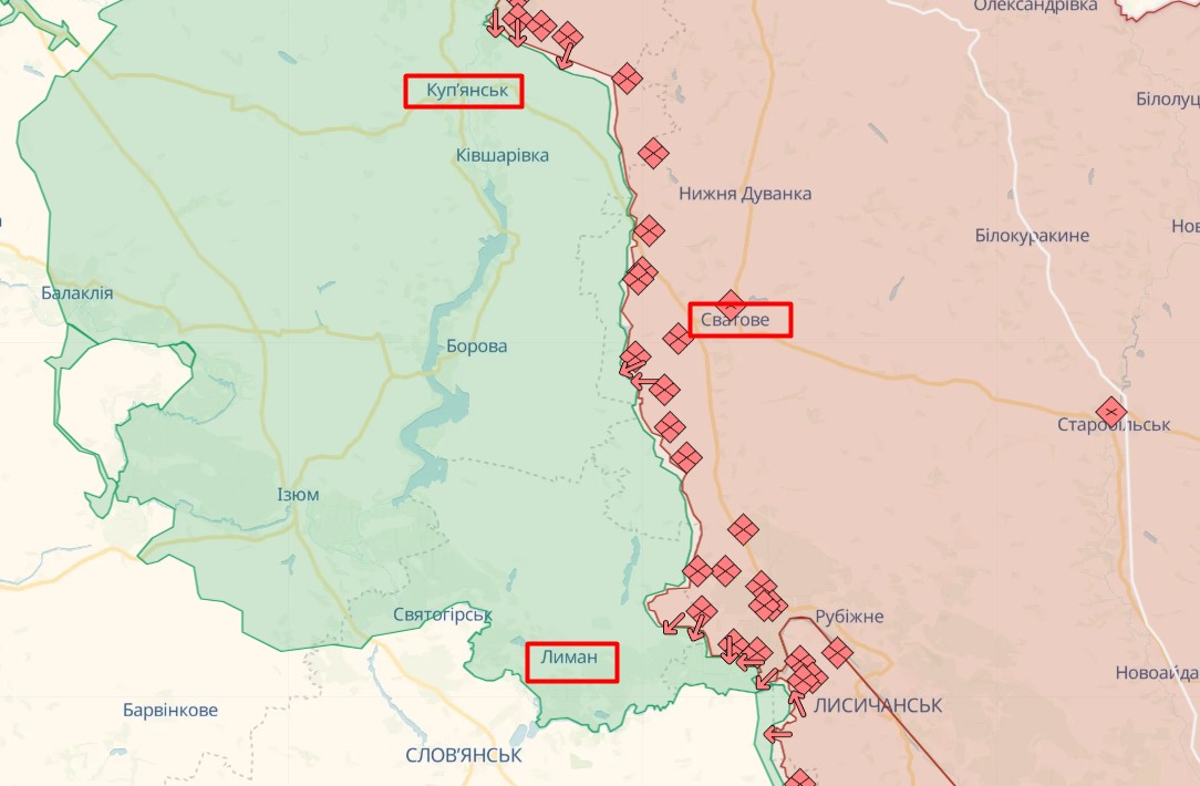 Лімано-Куп'янська вісь поки стабільна, але російський наступ може поновитися будь-якої миті (фото deepstatemap.live)