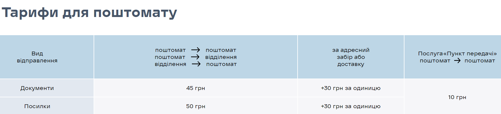 Тарифи на послугу "Пункт передачі" через пошту "Нової пошти" - натисніть на фото, щоб збільшити (novaposhta.ua)