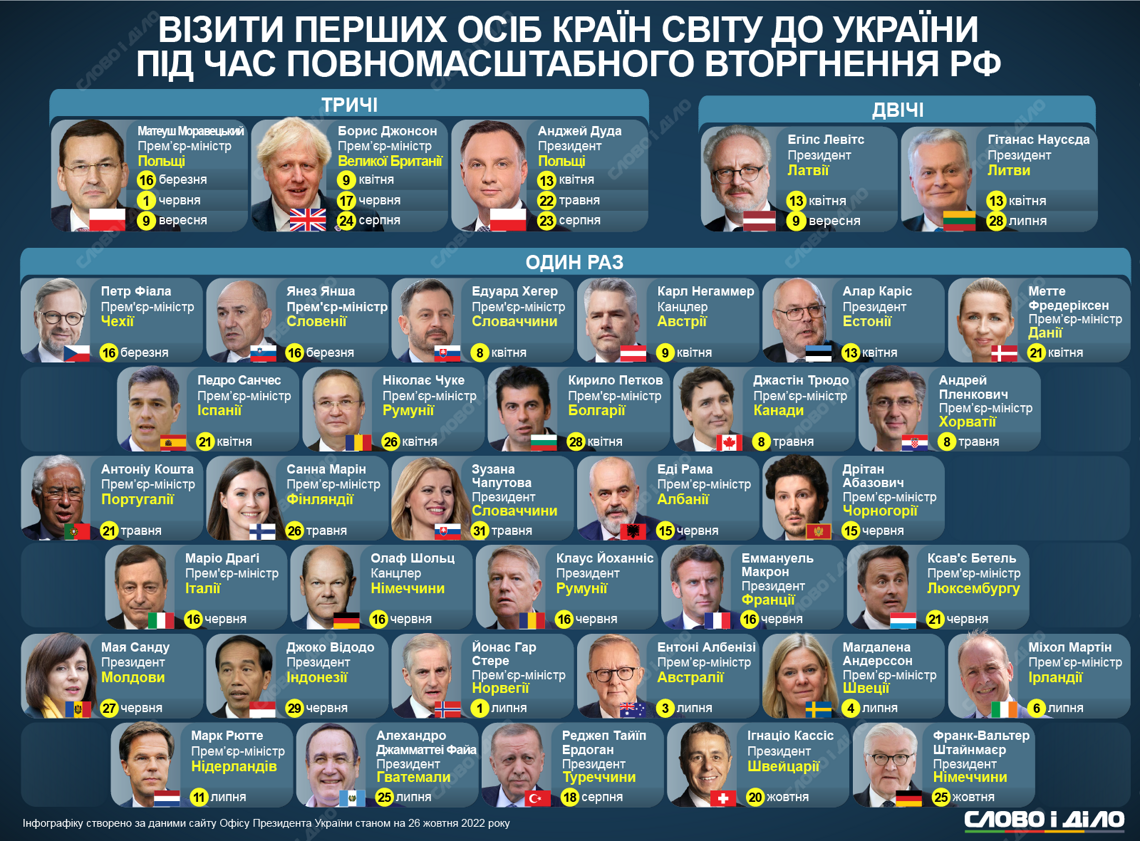 З початку повномасштабного вторгнення Україну відвідали десятки політиків, президентів різних країн та важливих чиновників. За 8 місяців до нашої країни приїхала рекордна кількість іменитих гостей.