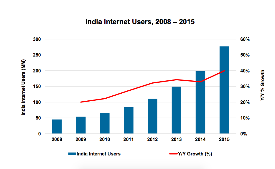 Зростання індійської інтернет-аудиторії в минулому році склало 40% порівняно із 33% роком раніше, тоді як у цілому в усьому світі зростання сповільнюється.