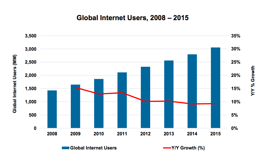 За даними Мікер, у 2015 користувачів інтернету у світі стало на 9% більше - 3 млрд осіб. Це вже майже половина усього населення планети (42%). У 2014 зростання цього показника склало 8%, попередніми роками він був вище - 10% у 2013 і 11% у 2012 році.