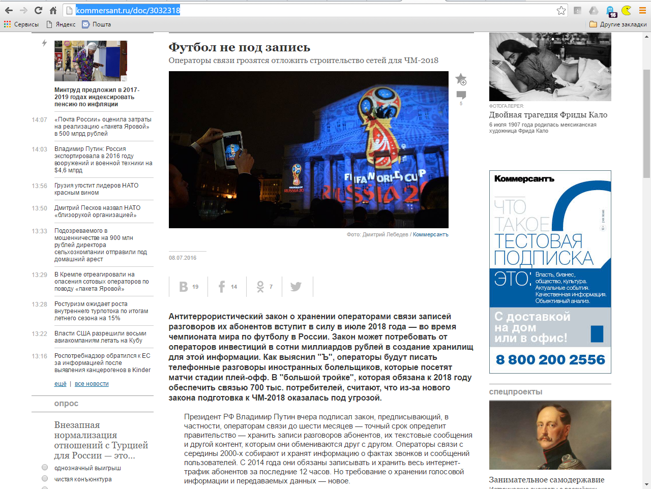 "У разі прийняття контртерористичних поправок в частині зберігання даних ні про які вкладеннях в інфраструктуру до ЧС-2018 не може бути й мови, так як нам доведеться витратити 200 млрд руб., Щоб виконати лише вимоги цього законопроекту", - підтвердили раніше озвучену позицію представники "Мегафона".