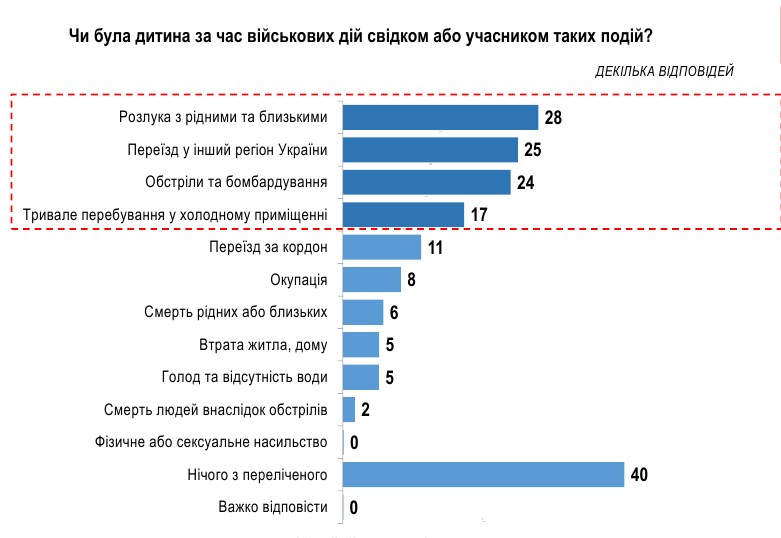 Чаще всего дети, по словам матерей, подвергались следующим травмирующим событиям: разлука с родными и близкими (28%), переезд в другой регион страны (25%), обстрелы и бомбардировки (24%), длительное пребывание в холодном помещении (17%).