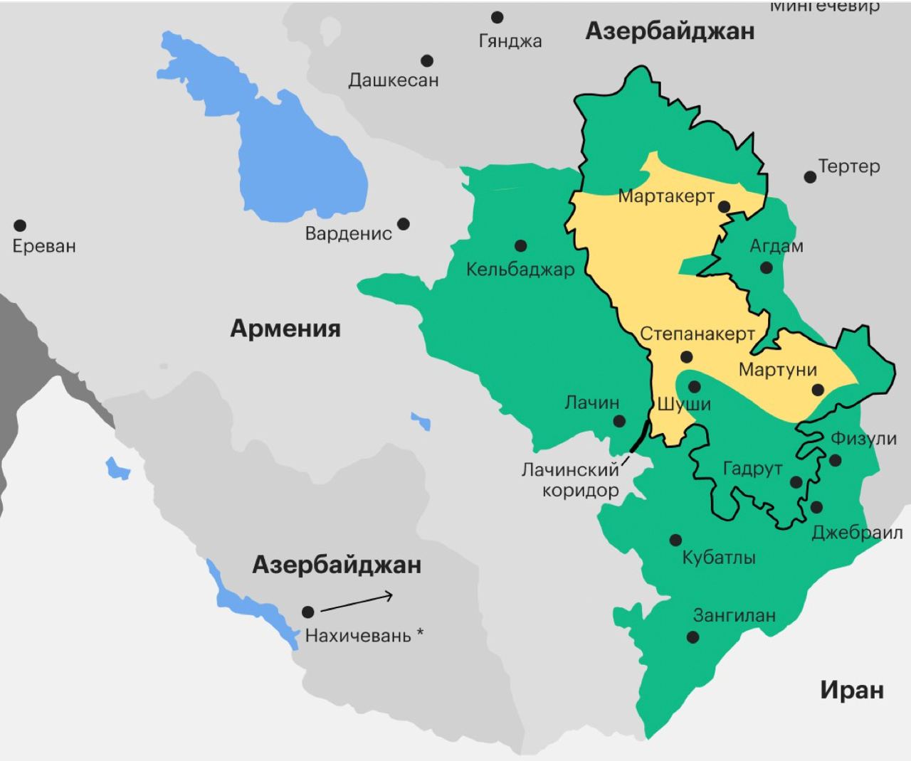 Согласно трехстороннему заявлению о прекращении огня от 9 ноября 2020 года, ему также отошли Агдамский, Кельбаджарский и Лачинский районы. На линию соприкосновения зашел российский контингент. Срок его пребывания определили 5 годами с возможностью продления. Параллельно Армения обязалась полностью вывести войска из Нагорного Карабаха.