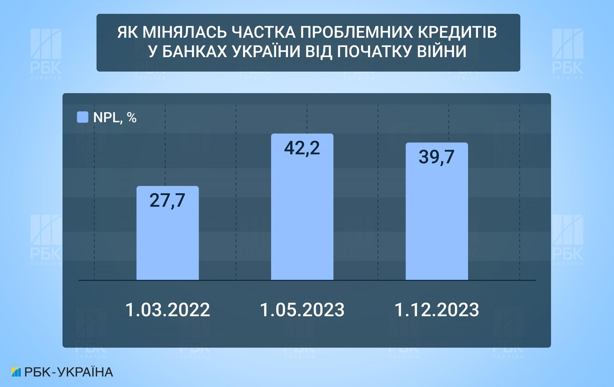 По данным НБУ, с 1 марта 2022 года по 1 мая 2023 года уровень NPL в общем портфеле кредитов банков юридическим и физическим лицам с 27,7% вырос до 42,2%, после чего наметилась тенденция к его сокращению на фоне ускорения кредитования банками и роста портфелей.