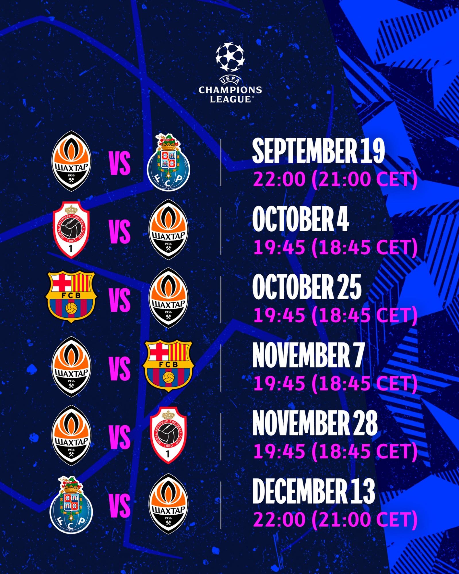 На 28 ноября назначен домашний поединок "Шахтера" против "Антверпена". Закрывать групповой этап команда Патрика ван Леувена 13 декабря в Порту. В 1/8 финала Лиги чемпионов выйдут две лучшие команды группы B. Третий на финише коллектив окажется в плей-офф Лиги Европы.