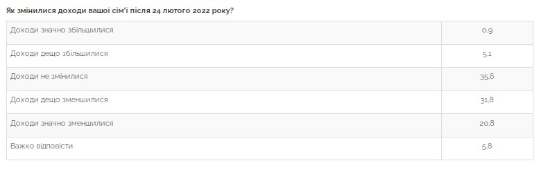Во время войны доходы большинства украинцев сократились. Отмечают, что доходы их семьи после 24 февраля 2022 значительно уменьшились, 21% опрошенных, а 32% сказали, что доходы несколько уменьшились.