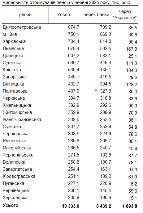 Через текущие счета в банках пенсии получают 8 млн 439,2 тысяч. Остальные 1 млн 893,8 тысяч пенсионеров получали выплаты через "Укрпочту".
