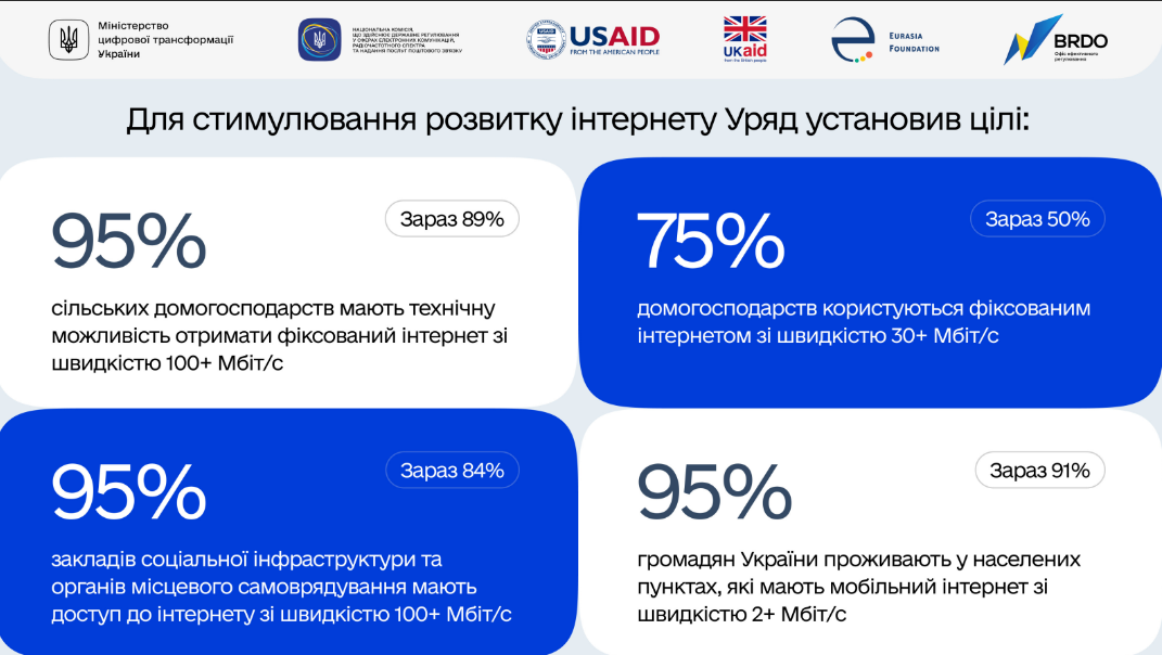 - мобильный интернет. 98% населения Украины получит доступ к мобильному широкополосному интернету. Средняя скорость передачи данных составит не менее 90 Мбит/с;