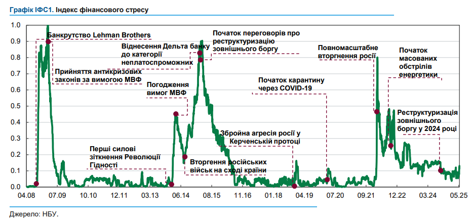 В течение первой половины 2025 года Индекс финансового стресса (ИФС), который измеряет НБУ, находился на самом низком уровне с начала полномасштабного вторжения, хотя и был волатильным.
