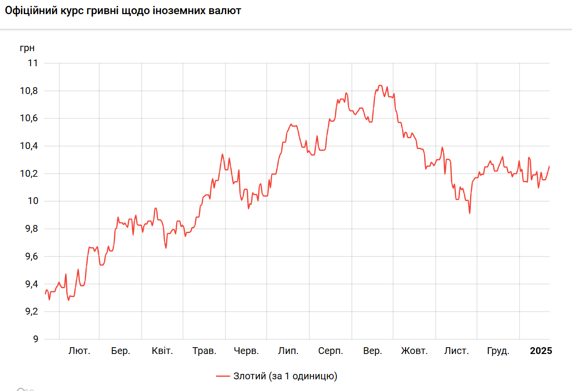 Официальный курс на 22 января 2025 года установлен на таком уровне: 10,2571 гривен за 1 злотый(+0,0374 грн).
