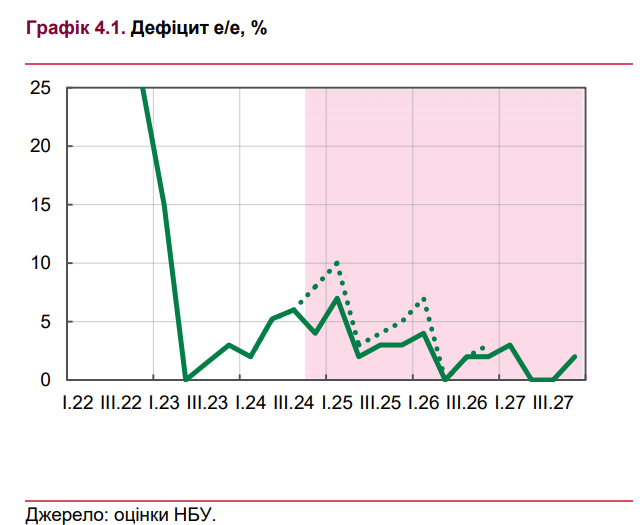 НБУ ожидает, что дефицит постепенно будет сокращаться, однако будет сохраняться и в последующие годы, поскольку восстановление энергосистемы требует значительного времени и финансирования. Потребность в э/э будет расти по мере дальнейшего восстановления экономики. Производство э/э также будет увеличиваться в результате дальнейших ремонтов маневровой генерации (ТЭС и ГЭС) и развития мощностей ВИЭ.