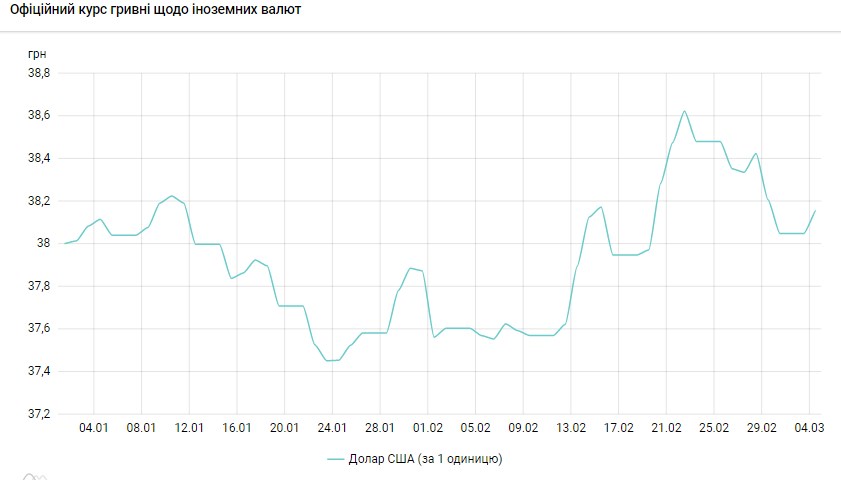 На начале прошлой недели курс на межбанке продолжал снижаться после рекордных максимумов середины февраля. К концу недели он упал до уровня 38,00 грн/доллар, а официальный курс - до 38,04 грн/доллар. Затем курс немного вырос. В итоге официальный курс снизился 38,35 до 38,15 грн/доллар.
