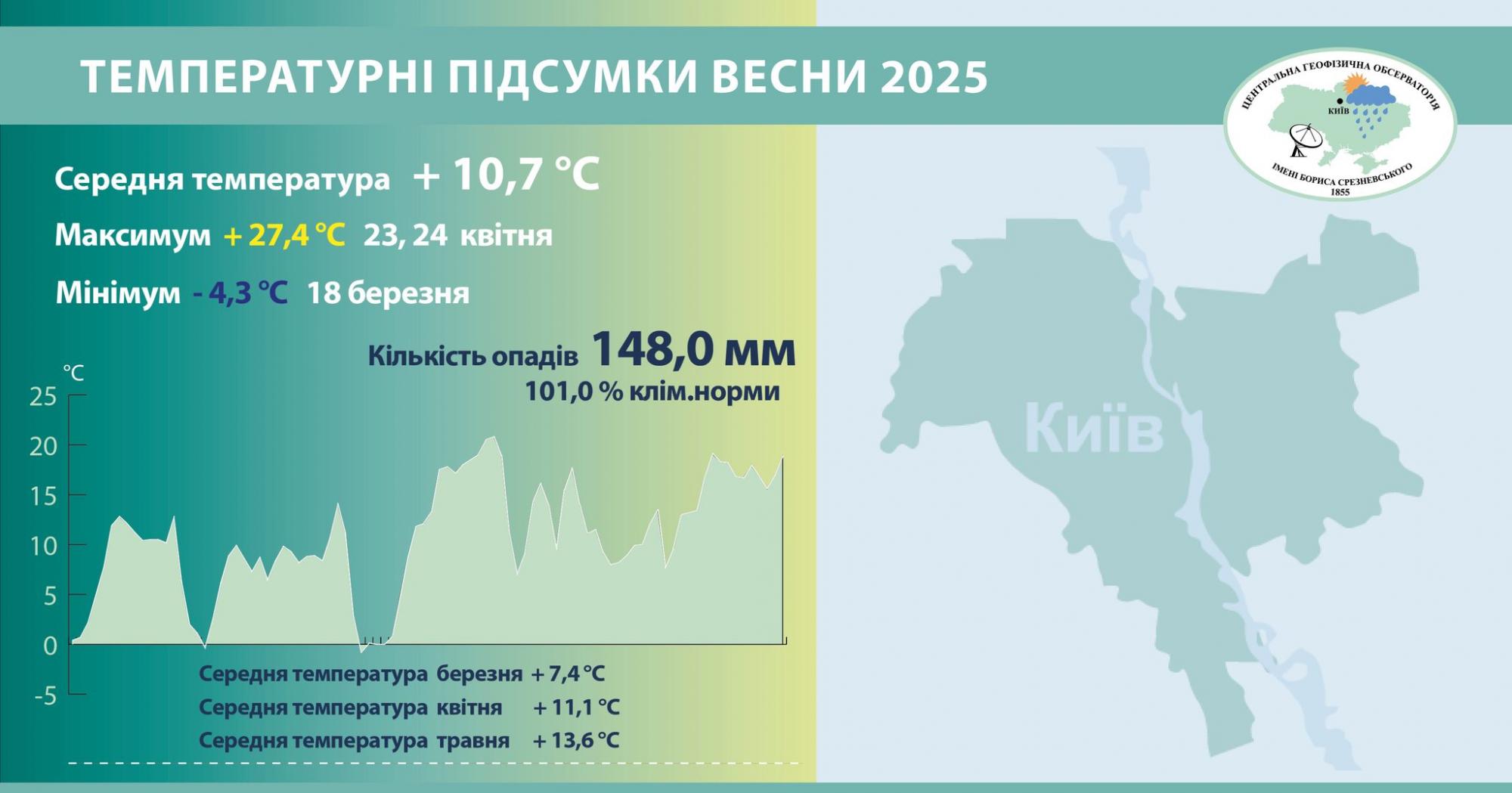 По данным синоптиков, среднемесячная температура воздуха за календарную весну составила 10,7 градусов, что выше климатической нормы на 1,3 градусов. Весна 2025 года стала десятой в рейтинге самых теплых в Киеве с 1881 года.
