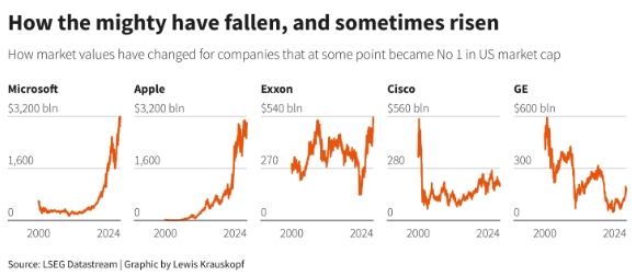 По словам Говарда Сильверблатта, старшего индексного аналитика S&P Dow Jones Indices, только 11 американских компаний с 1925 года достигли первого места по рыночной стоимости.