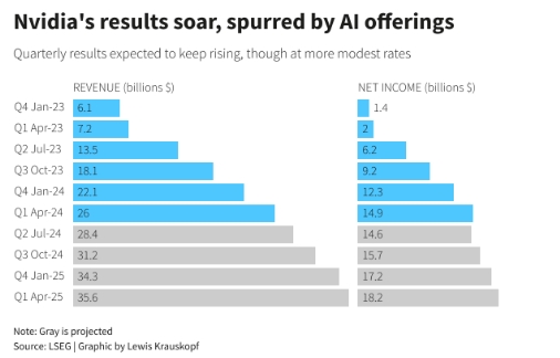 По данным LSEG, выручка в текущем финансовом году, как ожидается, увеличится примерно вдвое, до 120 млрд долларов., а затем вырастет еще на 33% в 2026 финансовом году, до 160 млрд долларов.
