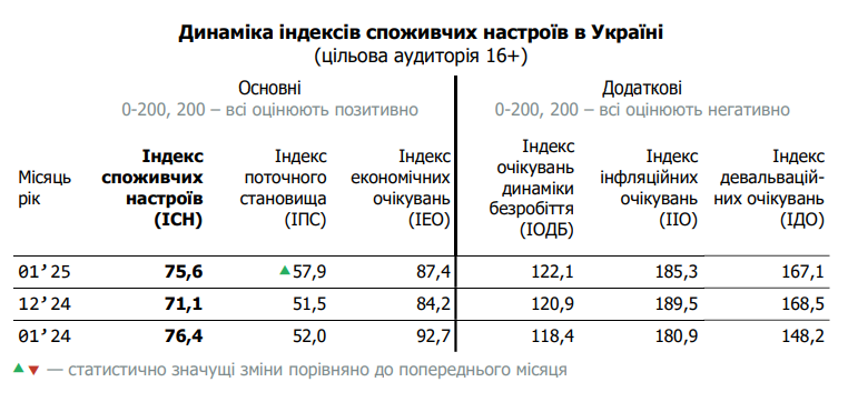 Индекс потребительских настроений украинцев в январе 2025 года вырос на 4,4 пункта и составляет 75,6 п. Выросли все составляющие индикатора за исключением Индекса ожидаемого развития экономики в течение пяти лет.