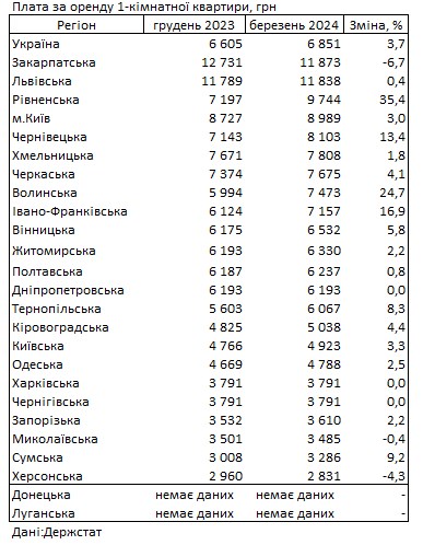 Средняя плата за месячную аренду 1-комнатной квартиры в марте 2024 года составила 6 851 гривну. С начала года стоимость выросла на 3,7%, при общей инфляции в 1,2%.