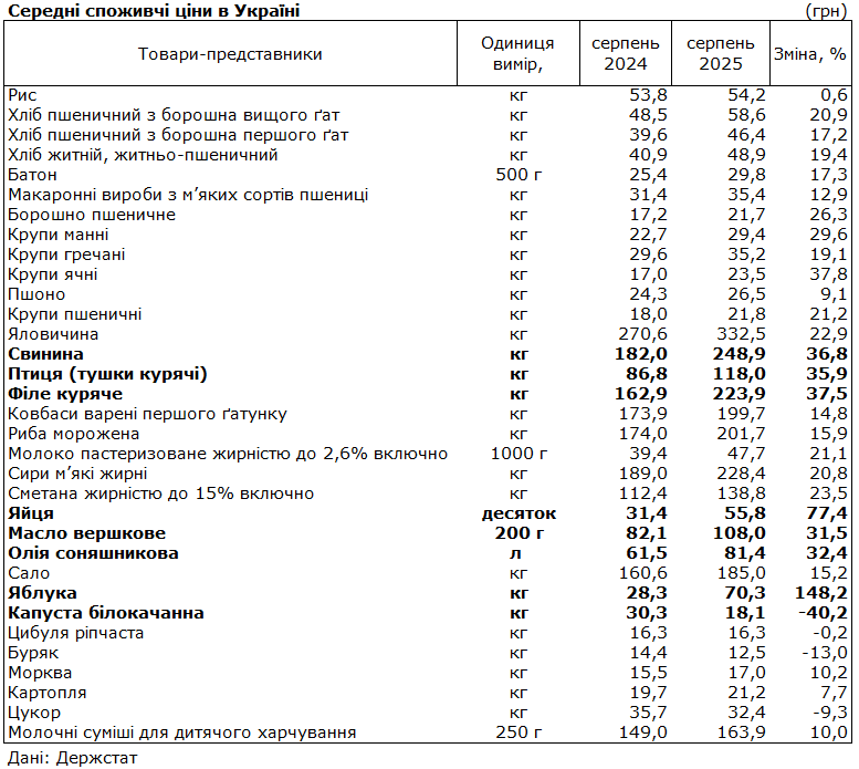 По данным Госстата, рост стоимости пищевых продуктов в августе 2025 года ощутимый в большинстве категорий. Особенно подорожали мясо, яйца и яблоки, что существенно влияет на потребительские расходы украинцев.