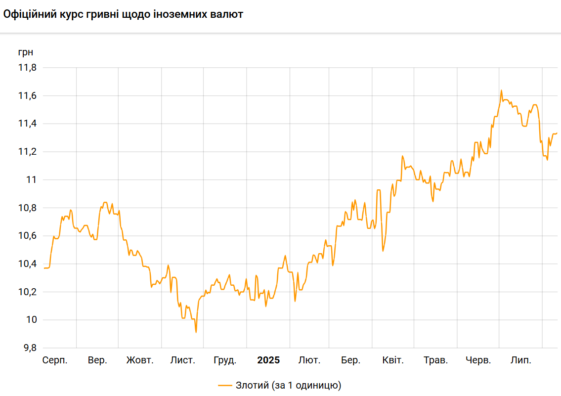 Официальный курс на 11 августа 2025 года установлен на таком уровне: 11,3362 гривен за 1 злотый (+0,0065 грн).