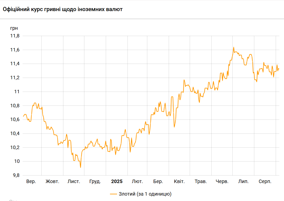 Официальный курс на 5 сентября 2025 года установлен на таком уровне: 11,3242 гривен за 1 злотый (-0,0112 грн).