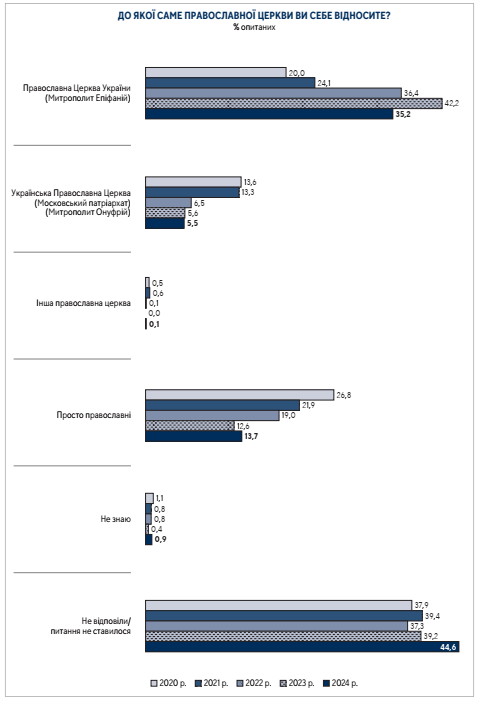 Однако в 2024 году отнесли себя к верным ПЦУ 35% опрошенных, что соответствует уровню 2022 году и меньше, чем в 2023 году.